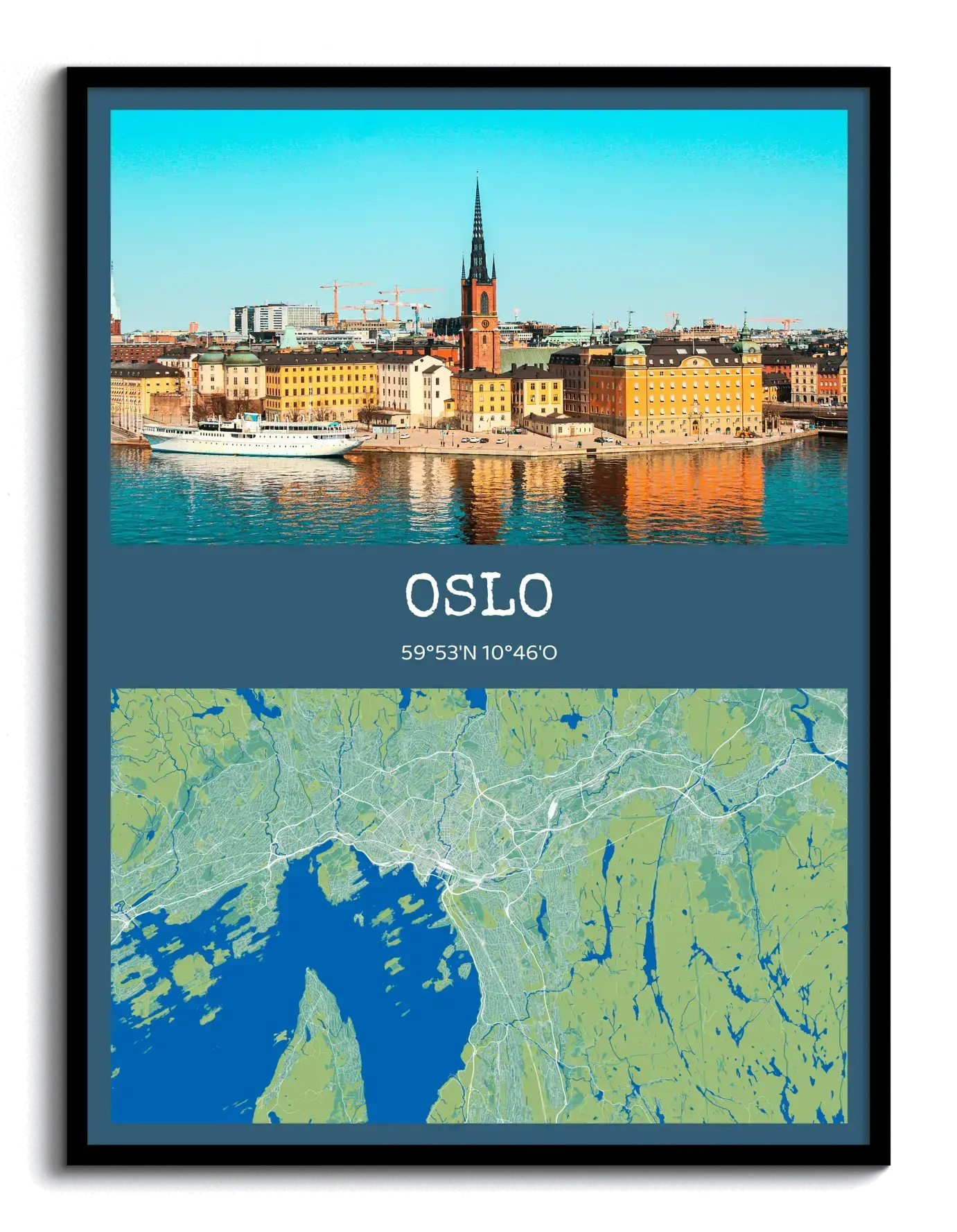 Custom city photo map with name, coordinates, and stylized map—fully customizable in color and view.