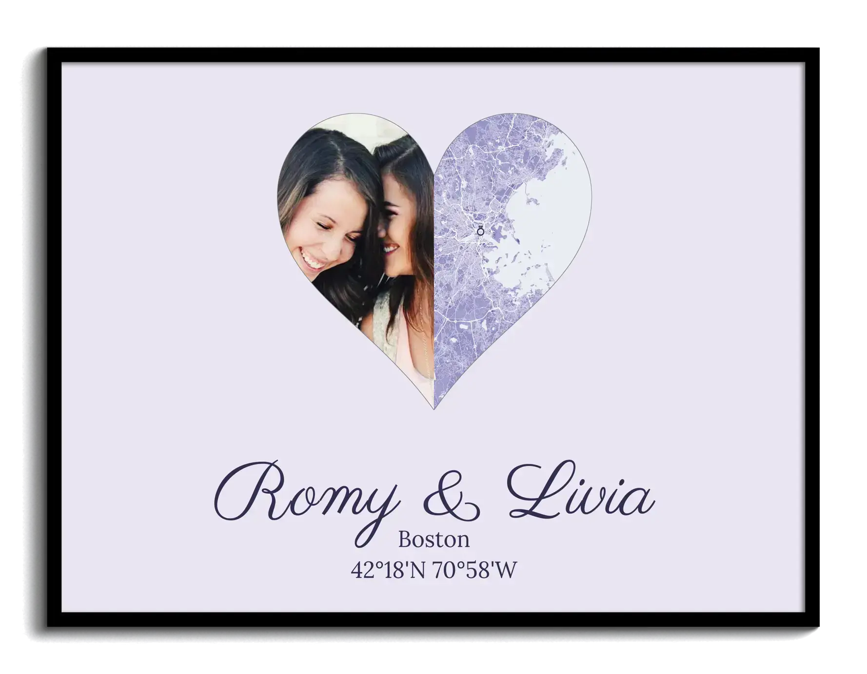 A split-heart photo collage with map marker and custom text—perfect for couples and milestones.